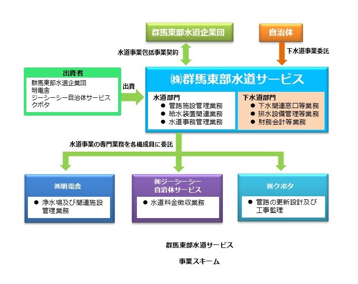 群馬東部水道サービスの事業スキームを紹介します。 当社は群馬東部水道企業団(地方公共団体)の出資を受けた官民出資会社です。 官の公益性・安定性に民間の技術・ノウハウを活用し群馬東部の水道事業を担うために設立されました。また、上下水道一体の運営が求められている中、当社は下水道事務補助にも取り組み複数の自治体より委託を受けています。 私たちの使命は、委託された業務を確実に遂行していくとともに、次世代への技術継承を進めながら、上下水道を通じて地域とともに成長する地域密着型事業を展開していくことです。